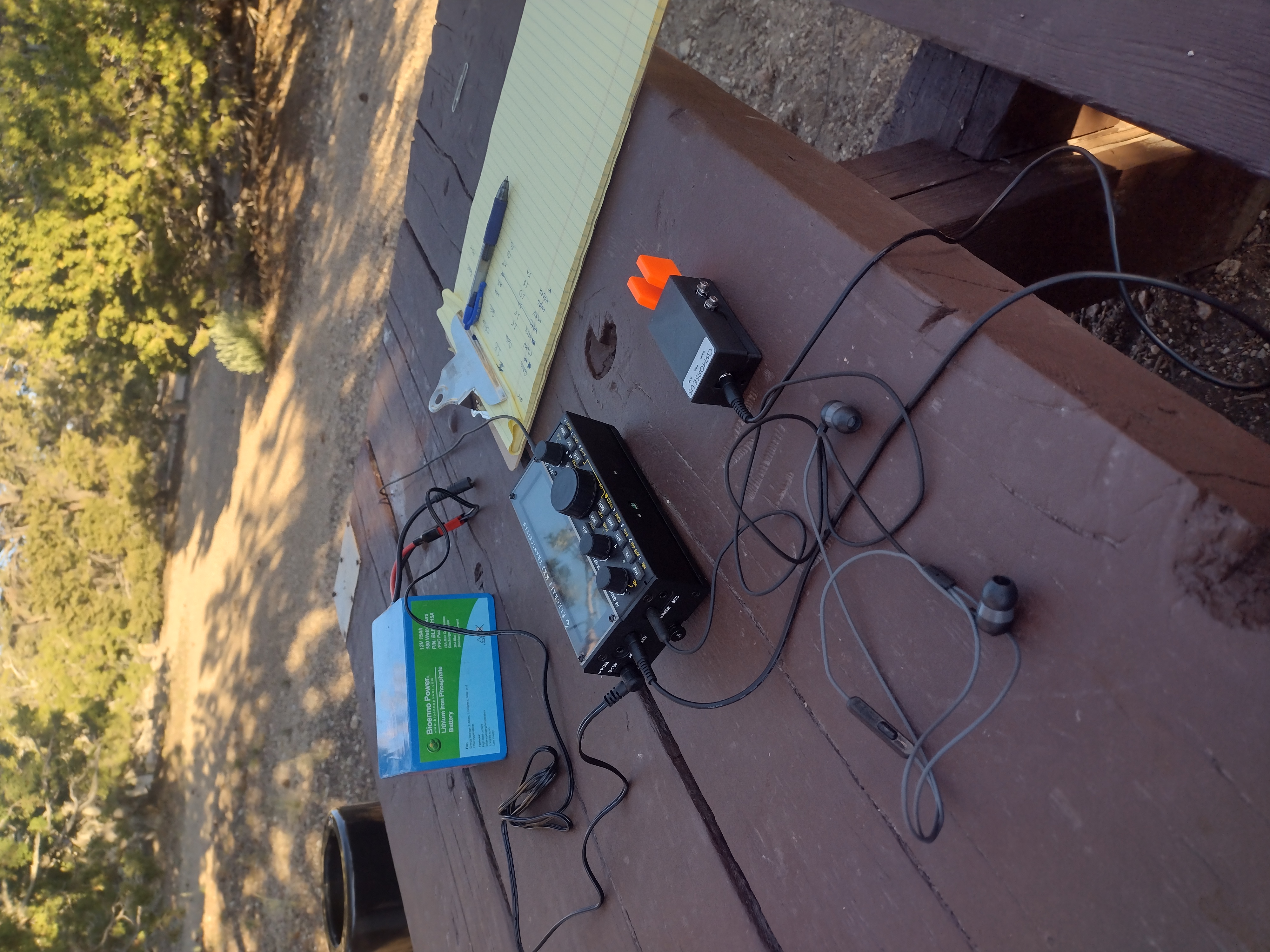 «Je me suis installé dans notre chalet familial sur le Mogollon Rim [Trail] près de Show Low [in Arizona]. [J’ai] utilisé un [Elecraft] K3, [une] batterie/onduleur Goal Zero Yeti 1500X, [un] panneau solaire de 200 W pour la charge de jour et une [MFJ] G5RV Junior [antenne] suspendue dans des pins [arbres] avec des cordes et des poulies préexistantes. [Je] partage mon temps entre JS8 et FT8 sur 40, 20 et 15 mètres. [C’était] une belle journée sur le terrain, [et] amusante !’